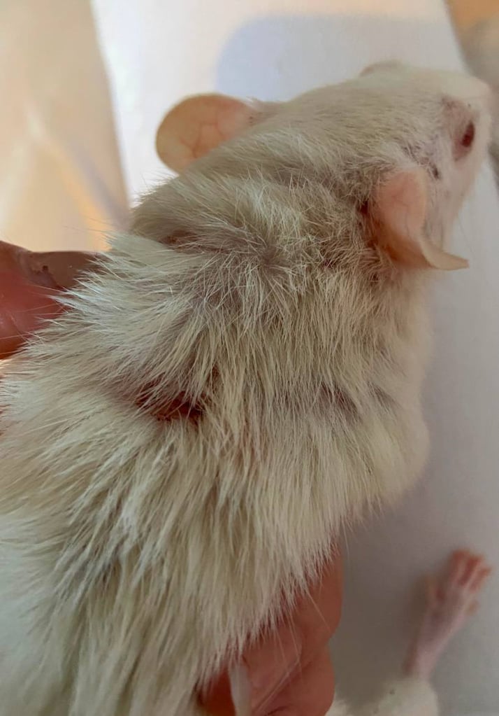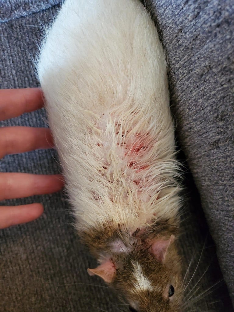 🔺 Свербіж – пацюк часто чухається, особливо в області шиї та вух, може вигризати хутро на спині.