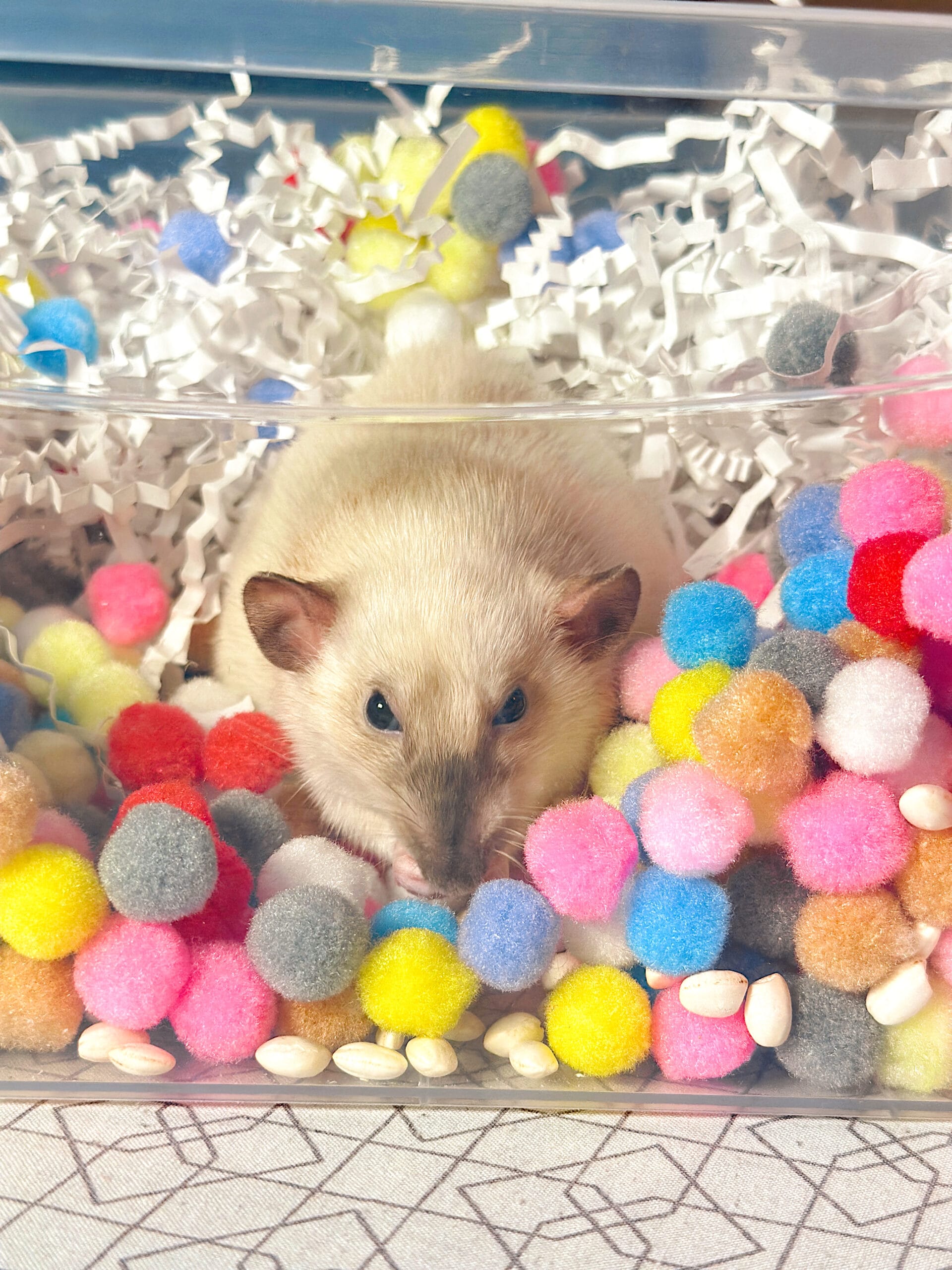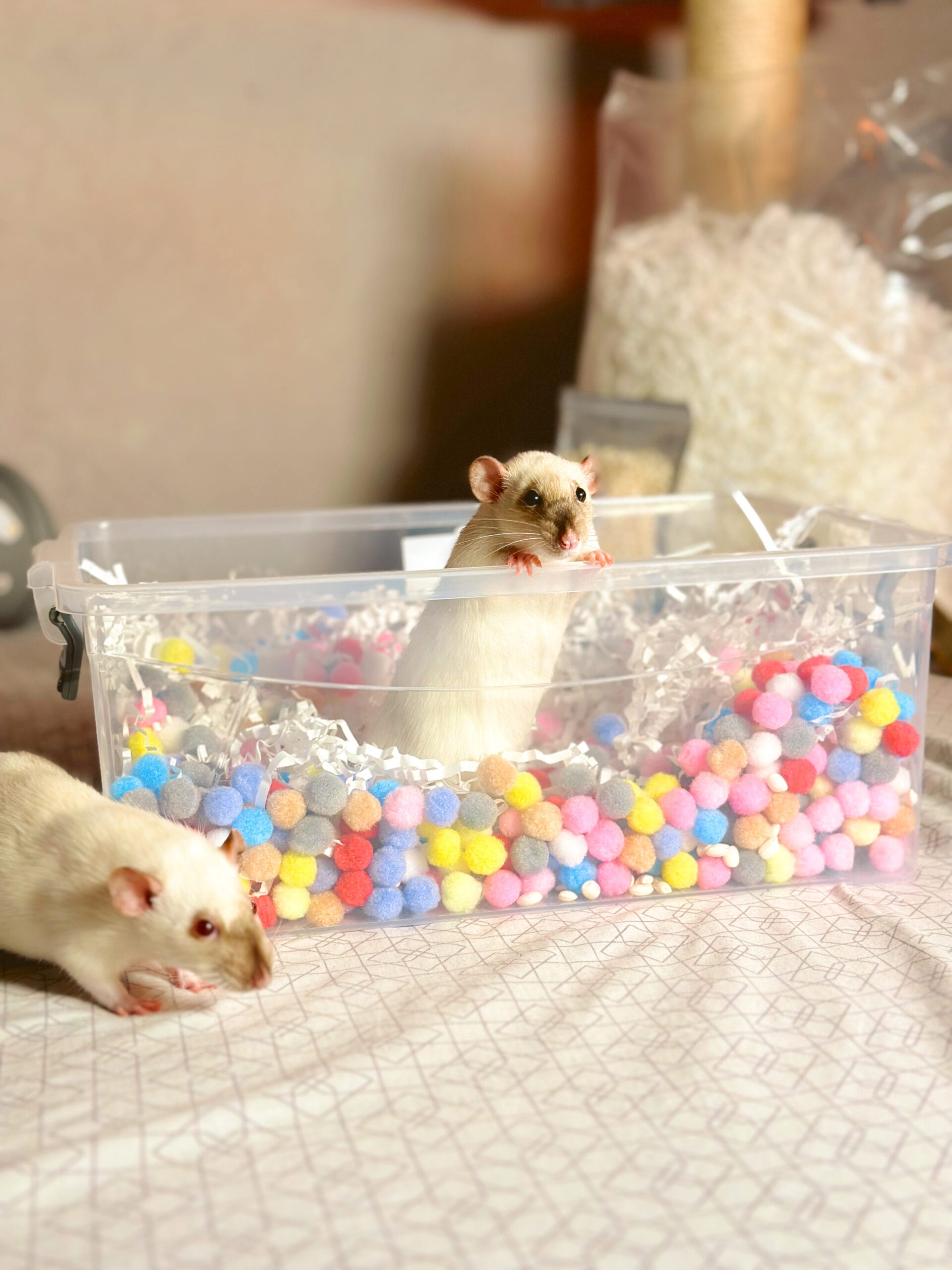 Висипте помпони в коробку або контейнер, заховайте серед них улюблені смаколики вашого пацюка – і насолоджуйтесь видовищем! Спостерігати, як пацючки риють, перебирають лапками кольорові кульки та шукають скарби – це справжня медитація ❤️