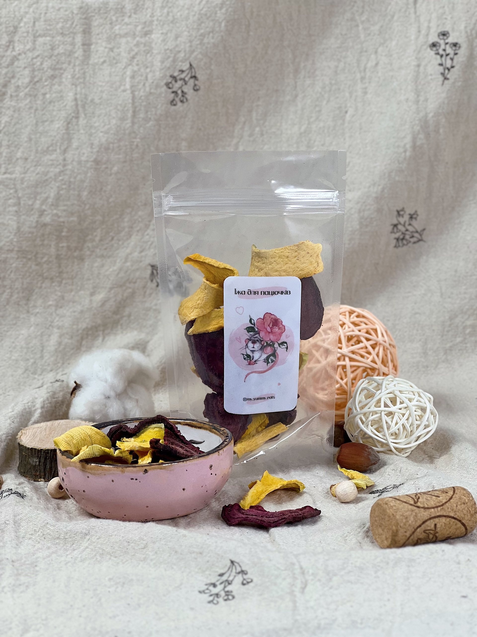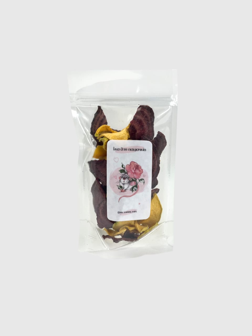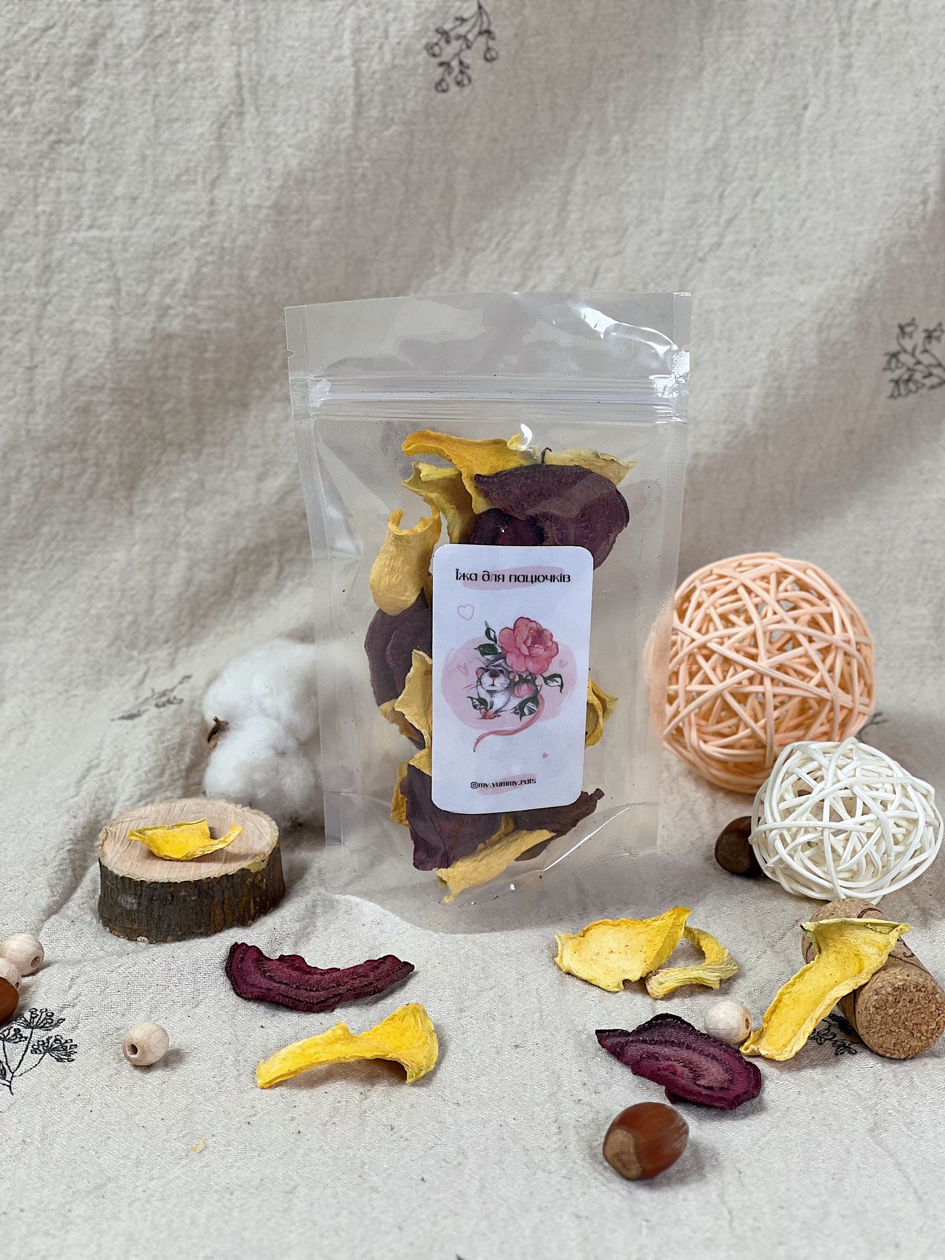 Чіпси “Гарбуз-Буряк” для пацючків — це неймовірне поєднання солодкуватого гарбуза та соковитого буряка, висушених до ідеальної хрусткості без додавання солі, цукру чи консервантів 🎃