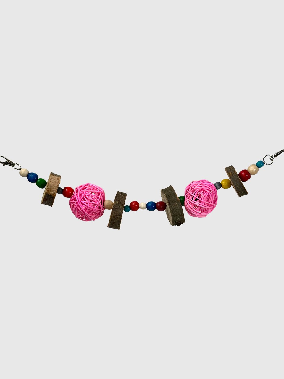 За рахунок натуральних деревʼяних кілець яблуні, деревʼяних бусін та ротангових кульок, іграшка не тільки приваблює гострі зубки гризунів, а й створює атмосферу затишку та краси в клітці ваших малюків ✨