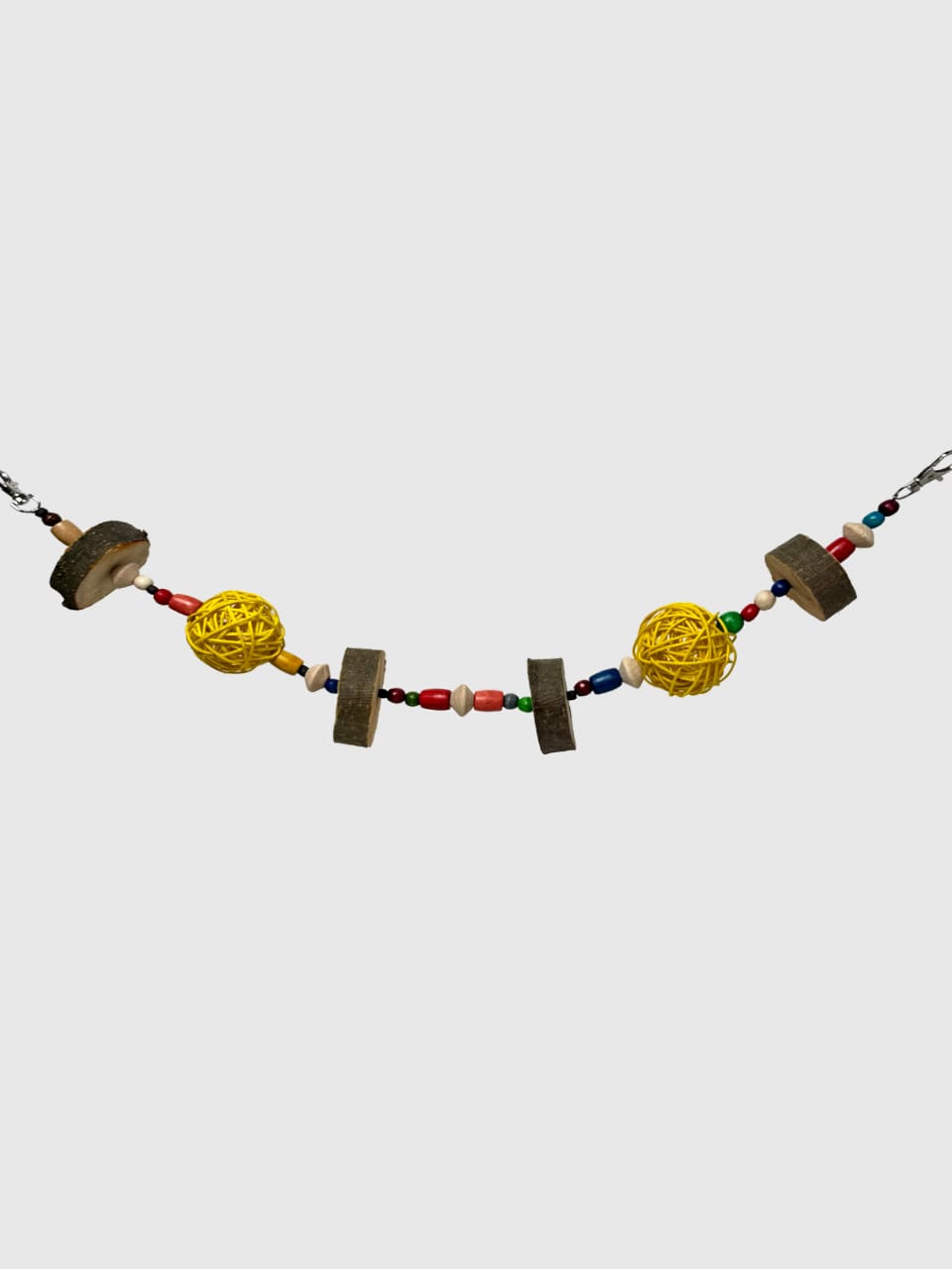 За рахунок натуральних деревʼяних кілець яблуні, деревʼяних бусін та ротангових кульок, іграшка не тільки приваблює гострі зубки гризунів, а й створює атмосферу затишку та краси в клітці ваших малюків ✨