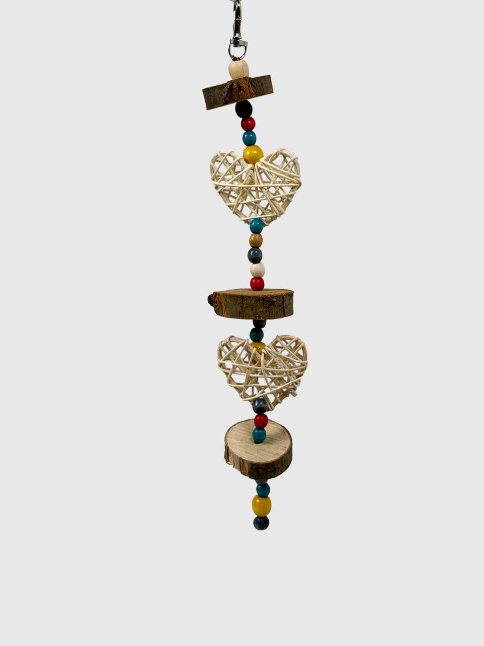 За рахунок натуральних деревʼяних кілець яблуні, деревʼяних бусін та ротангових кульок, іграшка не тільки приваблює гострі зубки гризунів, а й створює атмосферу затишку та краси в клітці ваших малюків ✨