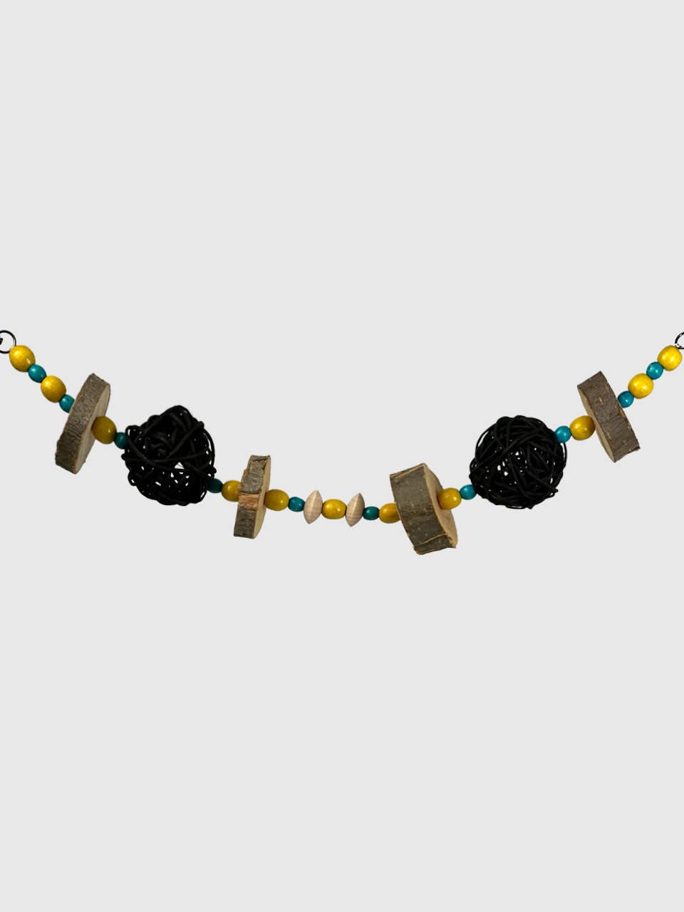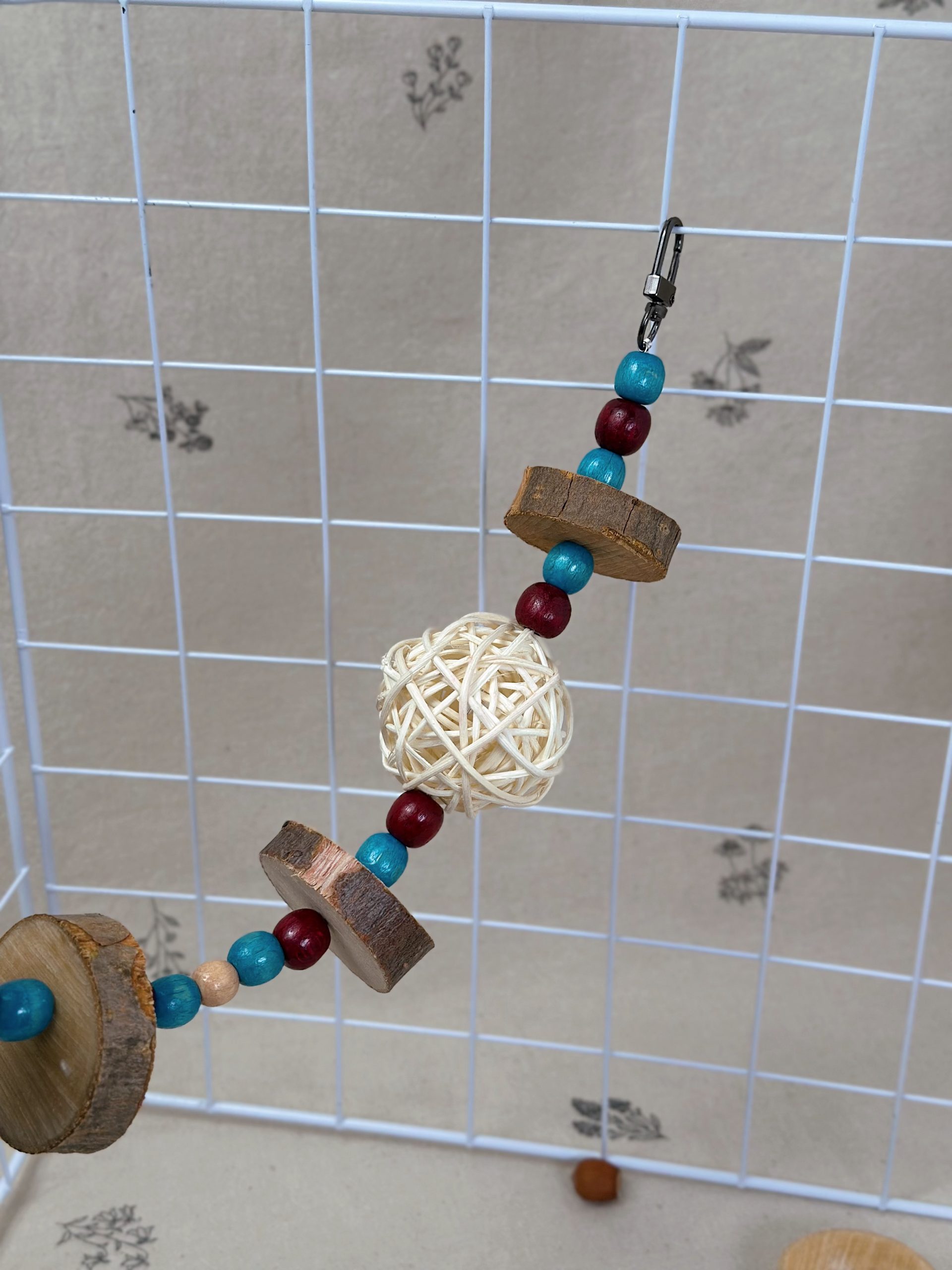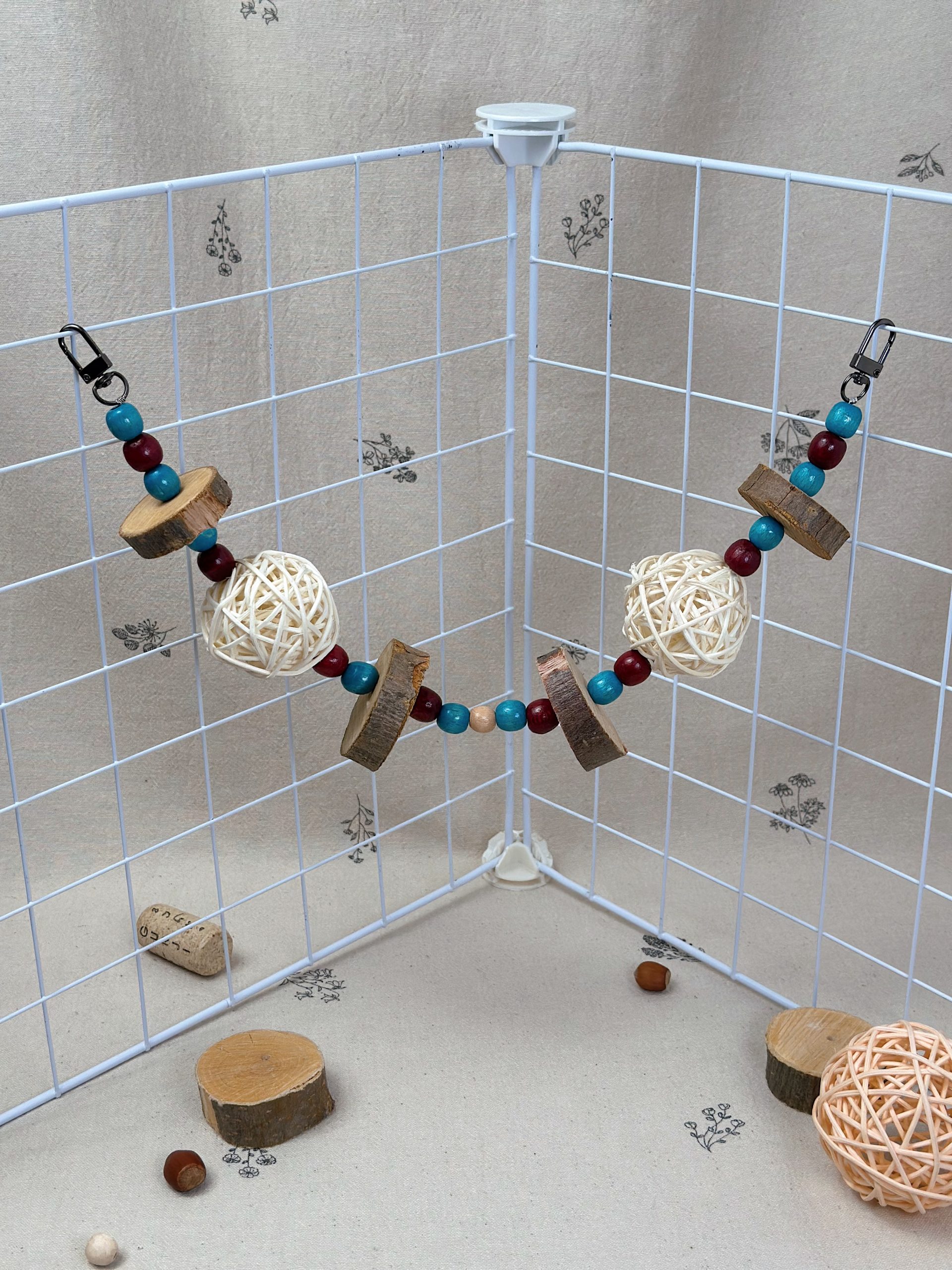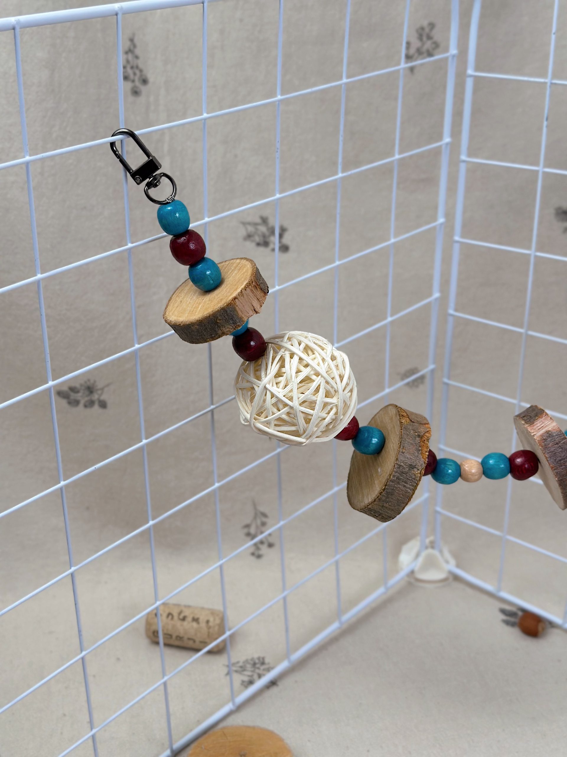 За рахунок натуральних деревʼяних кілець яблуні, деревʼяних бусін та ротангових кульок, іграшка не тільки приваблює гострі зубки гризунів, а й створює атмосферу затишку та краси в клітці ваших малюків ✨