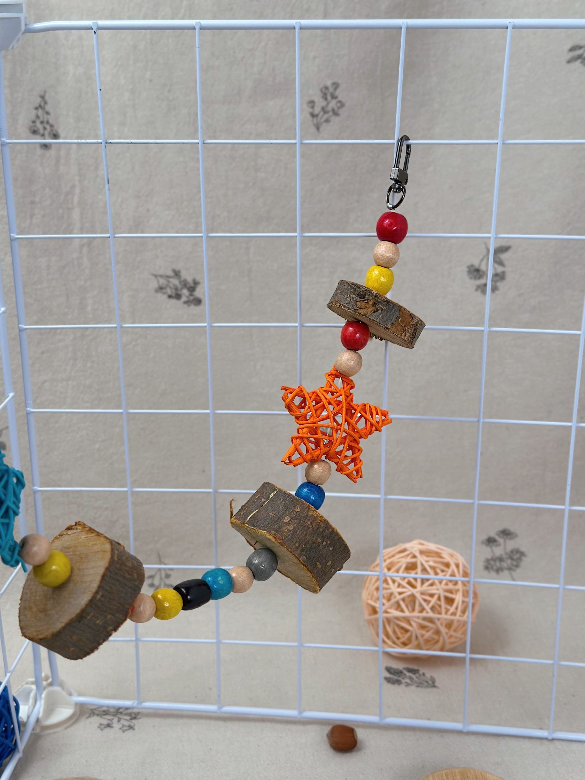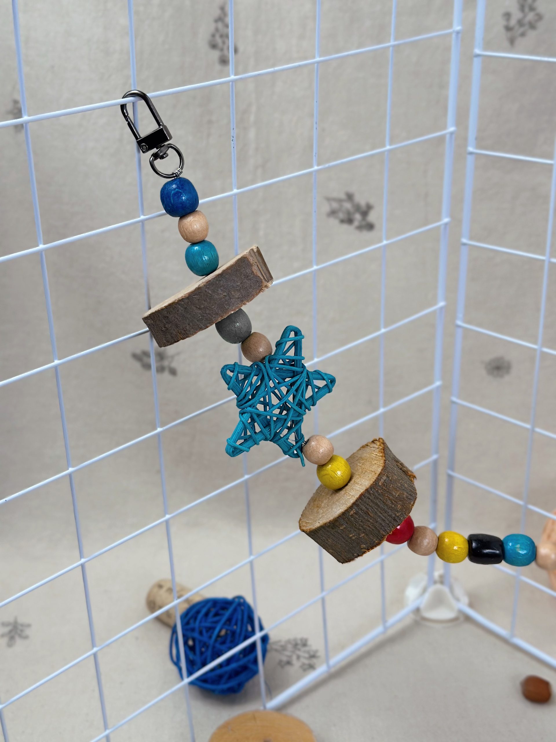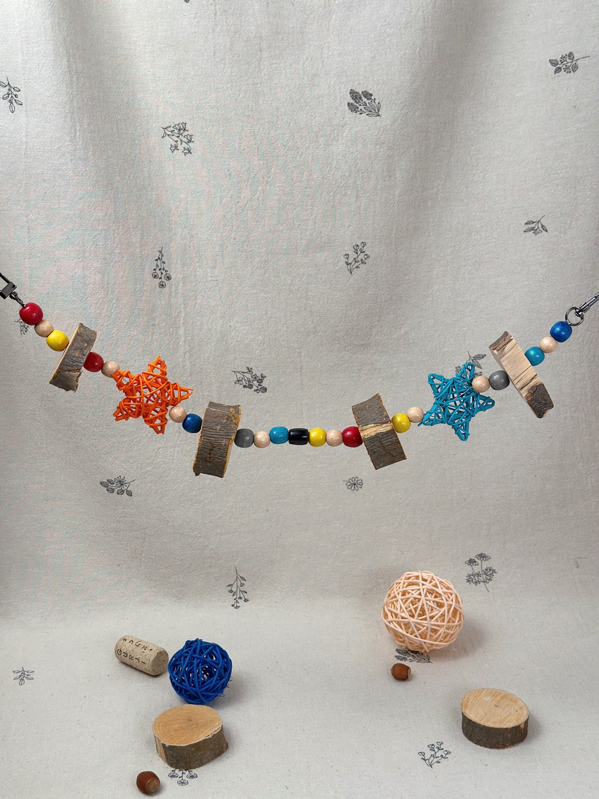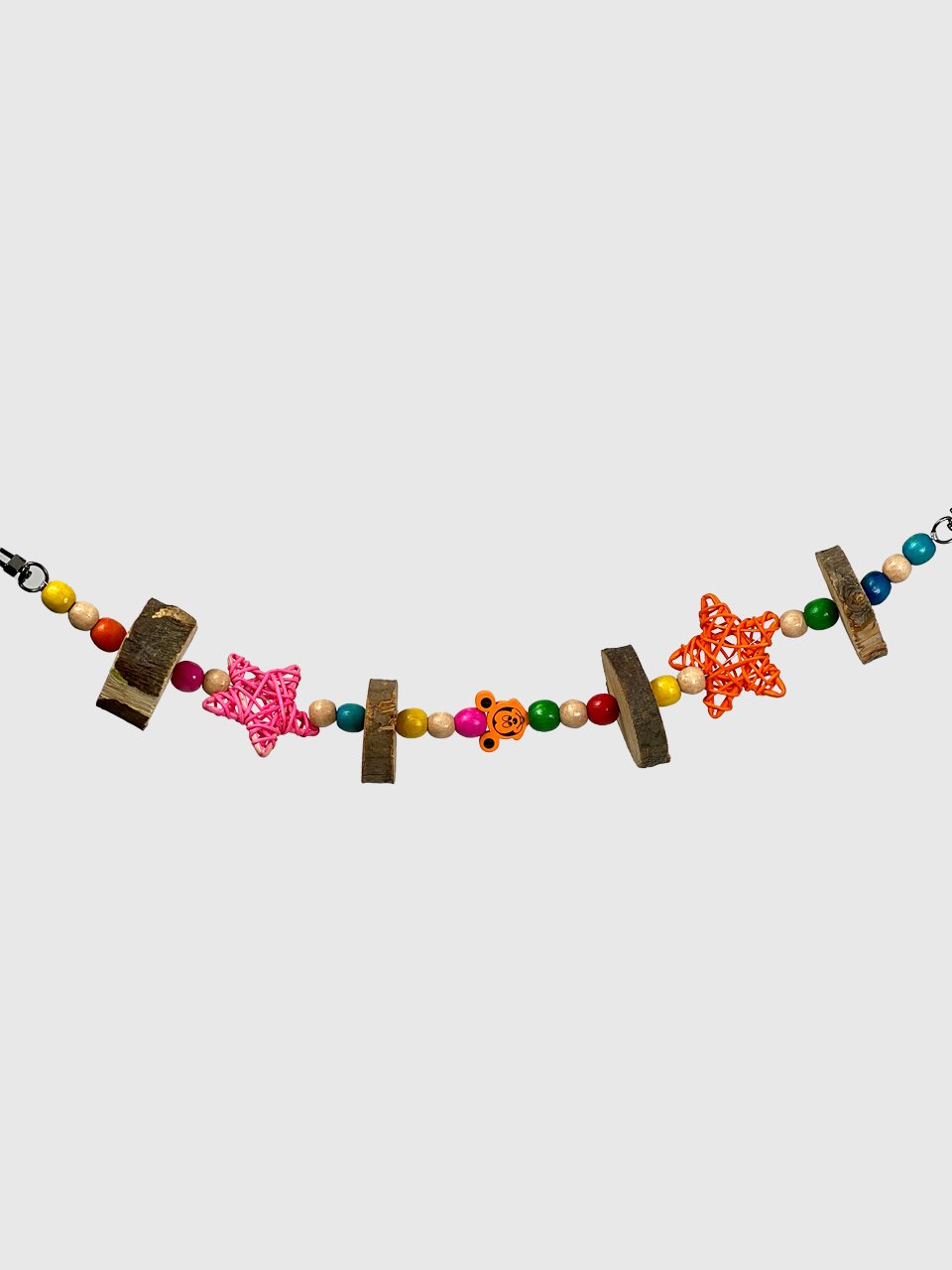 За рахунок натуральних деревʼяних кілець яблуні, деревʼяних бусін та ротангових кульок, іграшка не тільки приваблює гострі зубки гризунів, а й створює атмосферу затишку та краси в клітці ваших малюків ✨