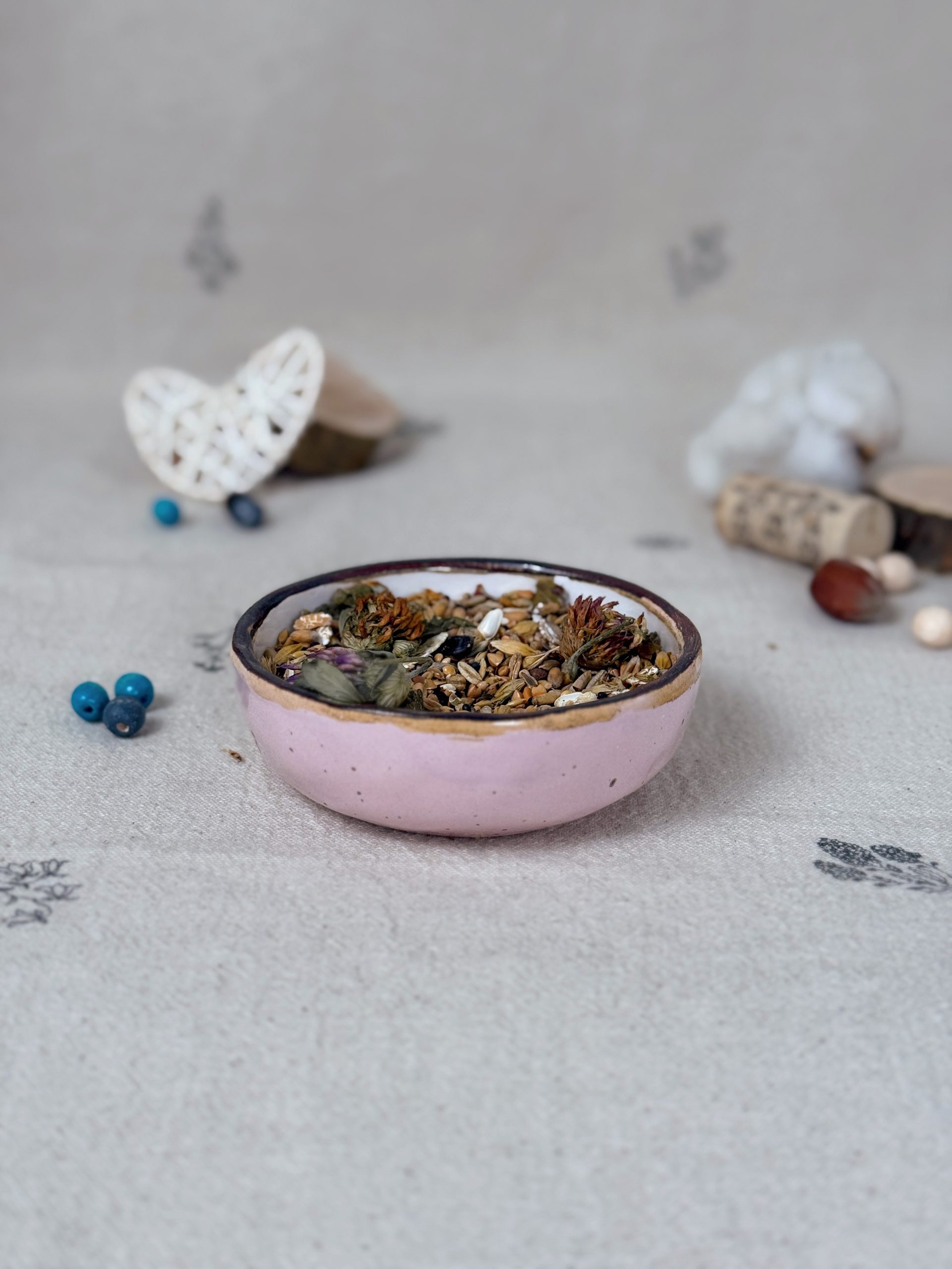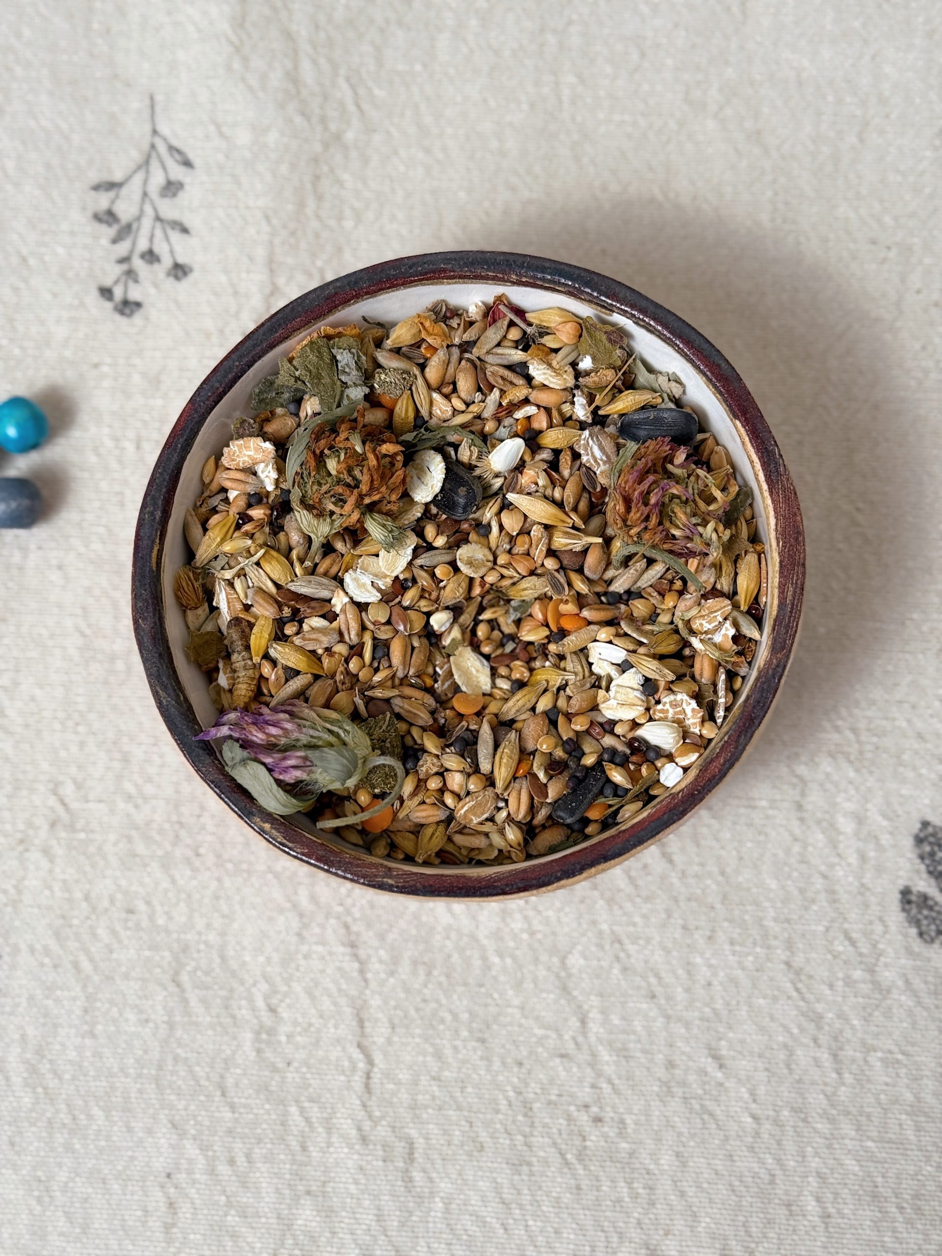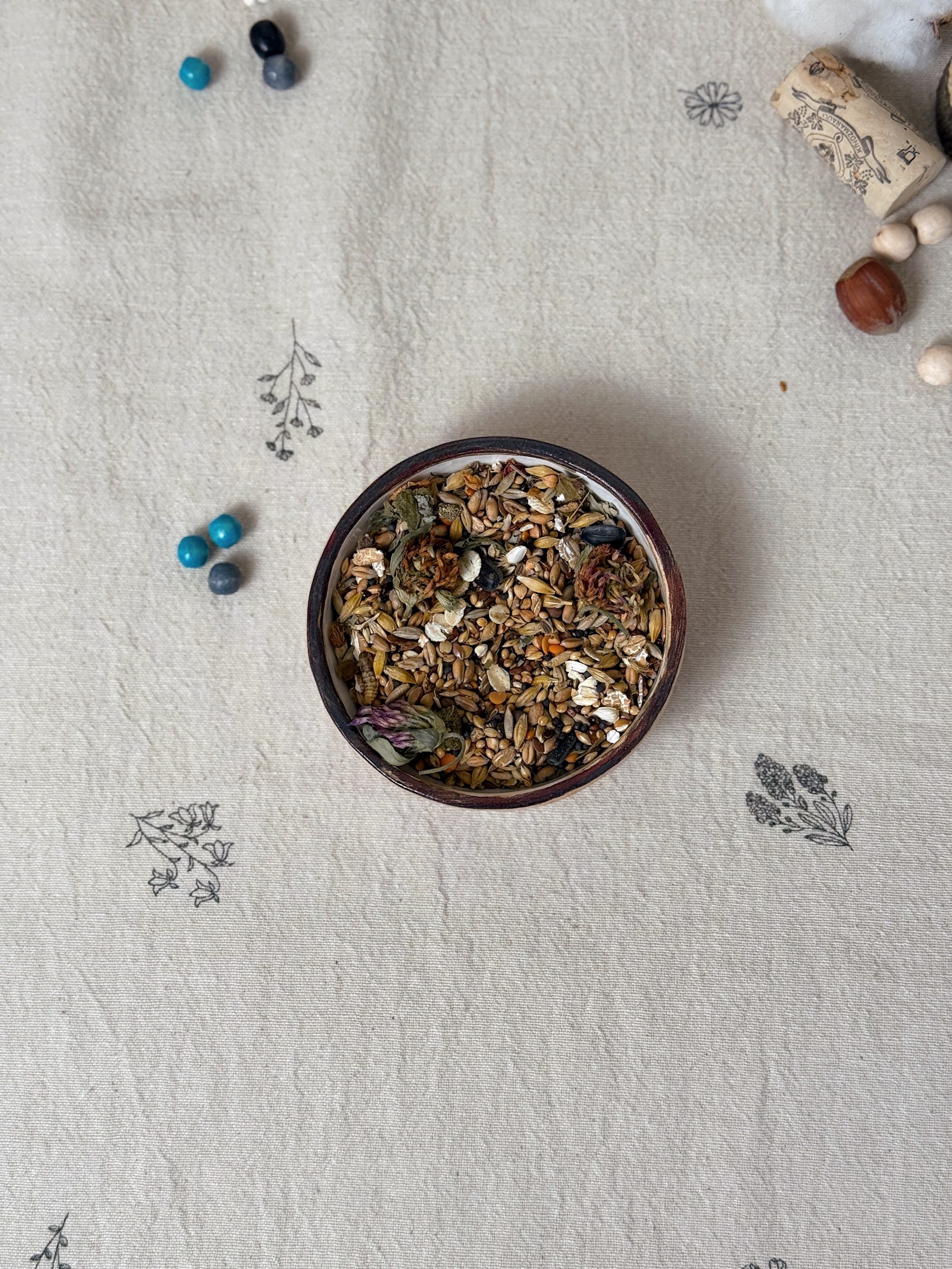 📋 Склад: пшениця, ячмінь, жито, гречка зелена, хлоп’я (гречані, вівсяні, ячмінні), соняшникове та гарбузове насіння, гамарус, чорна львинка, трав’яні гранули, льон, просо, канарник, сафлор, сочевиця, укроп, конюшина, люцерна, амарант, гірчиця, ріпак, суданка, мікс лугових трав.