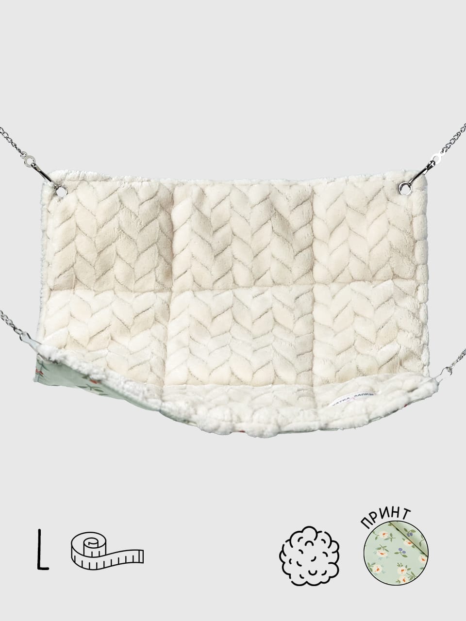 Завдяки зручним кріпленням гамачок легко фіксується у клітці та витримує кілька хвостиків одночасно. Його можна розмістити як на нижньому рівні клітки, так і вище, створюючи додатковий простір для ігор та пересування.