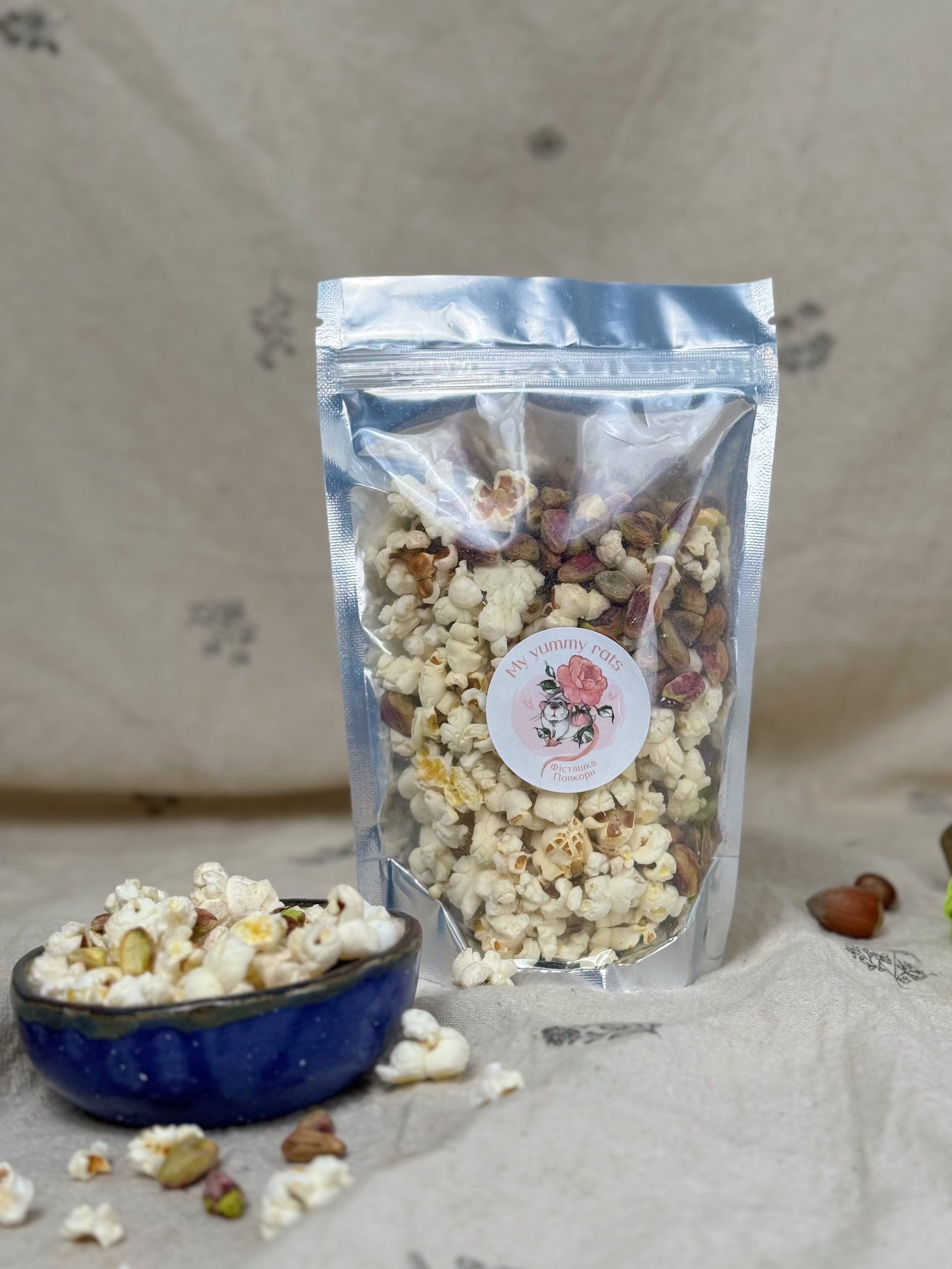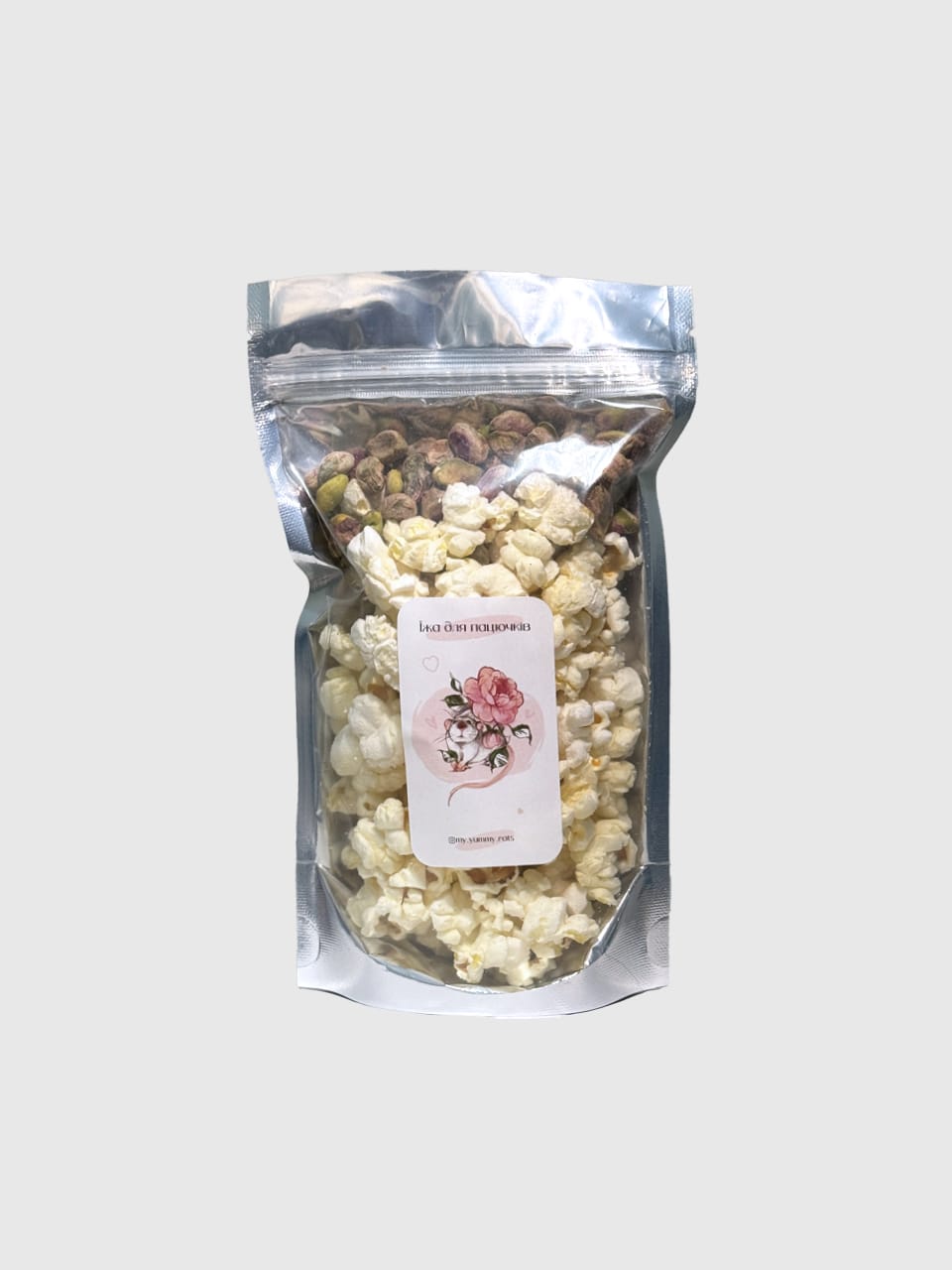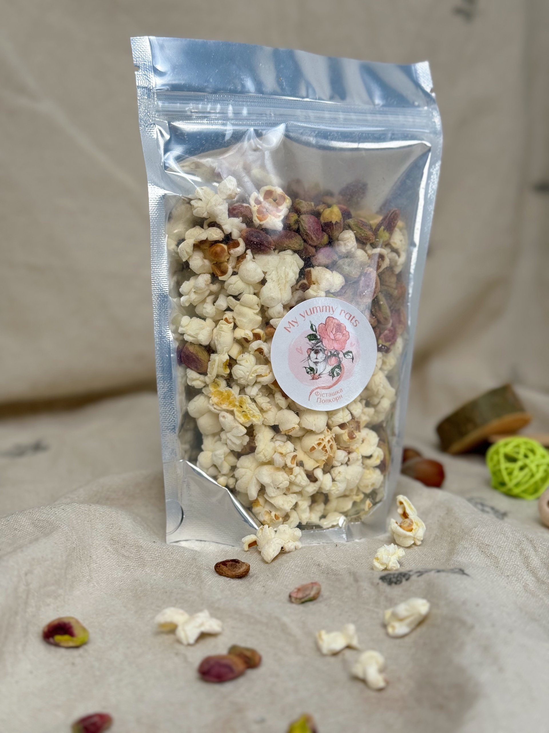 Смаколик “Фісташка + Попкорн” для пацючків — це вишукана комбінація хрусткого попкорну та ароматних фісташок без додавання будь-яких спецій та ароматизаторів 🤩