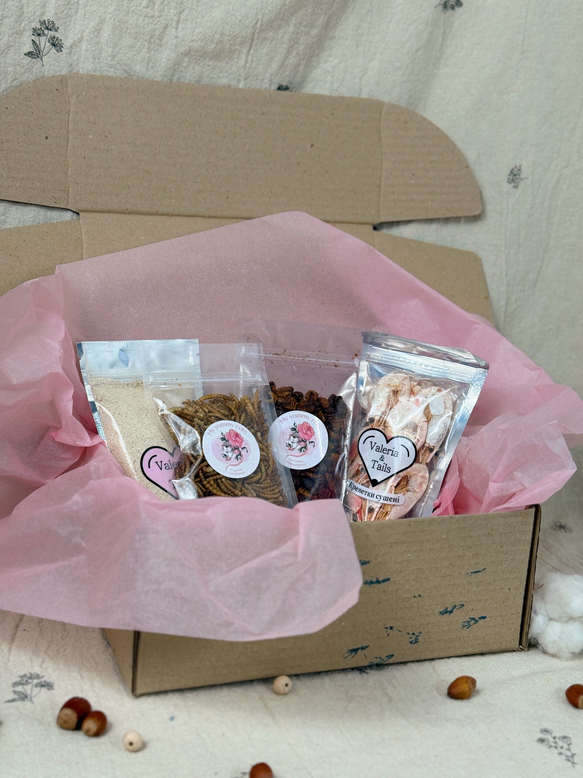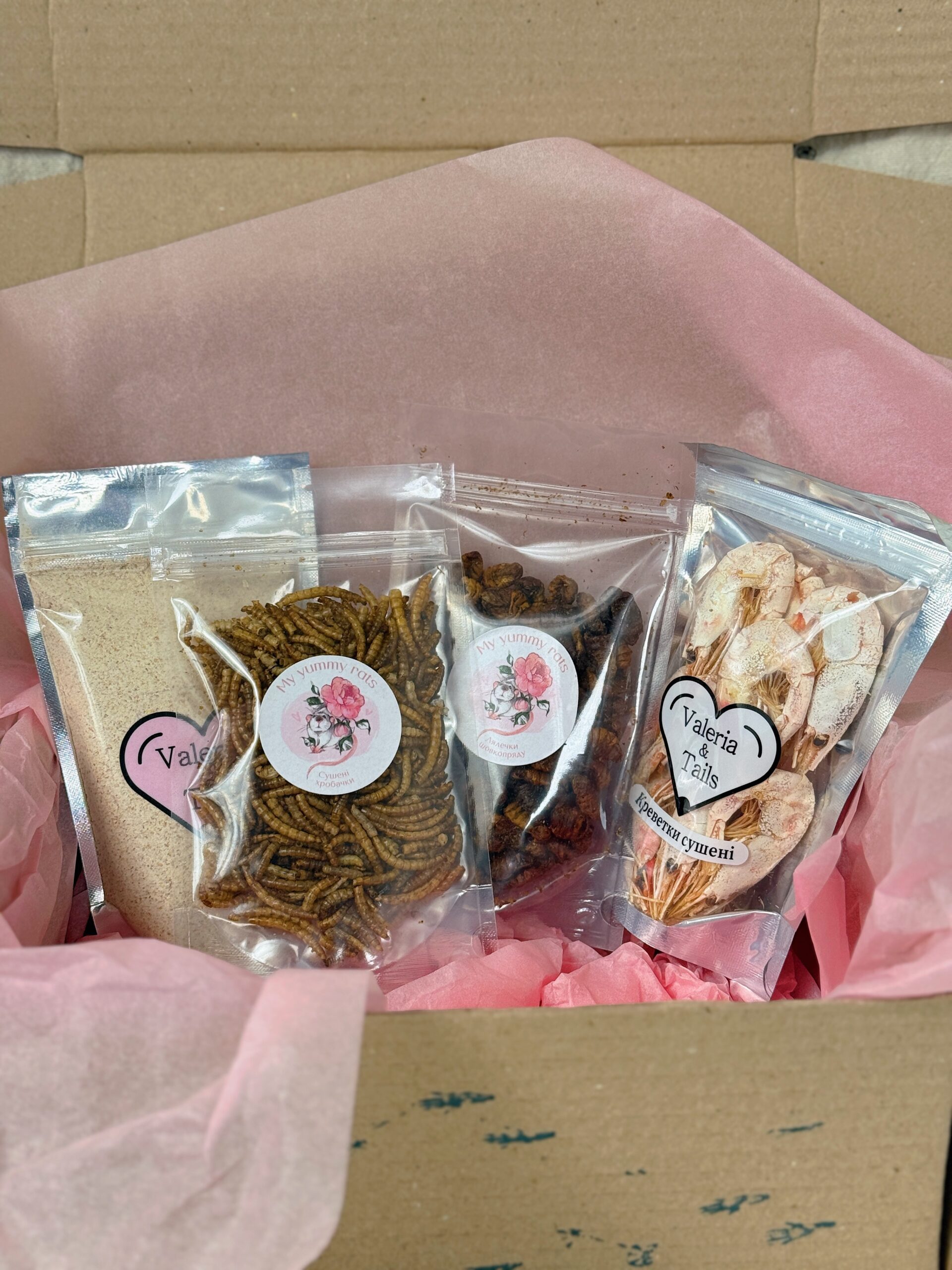 У наборі — 4 види смаколиків тваринного походження: сушені креветки, хробачки, шовкопряд та мʼясна пюрешка 🍗