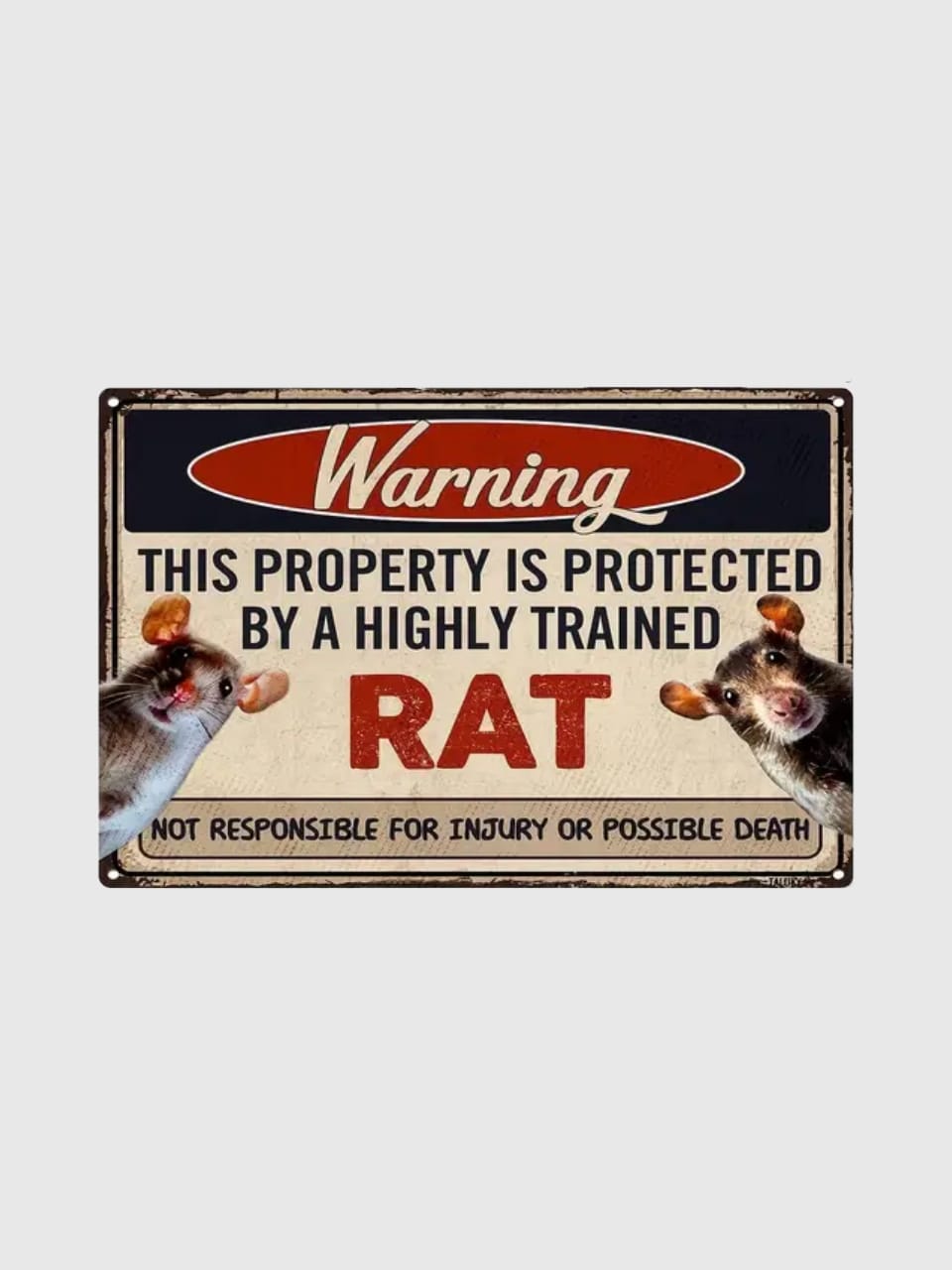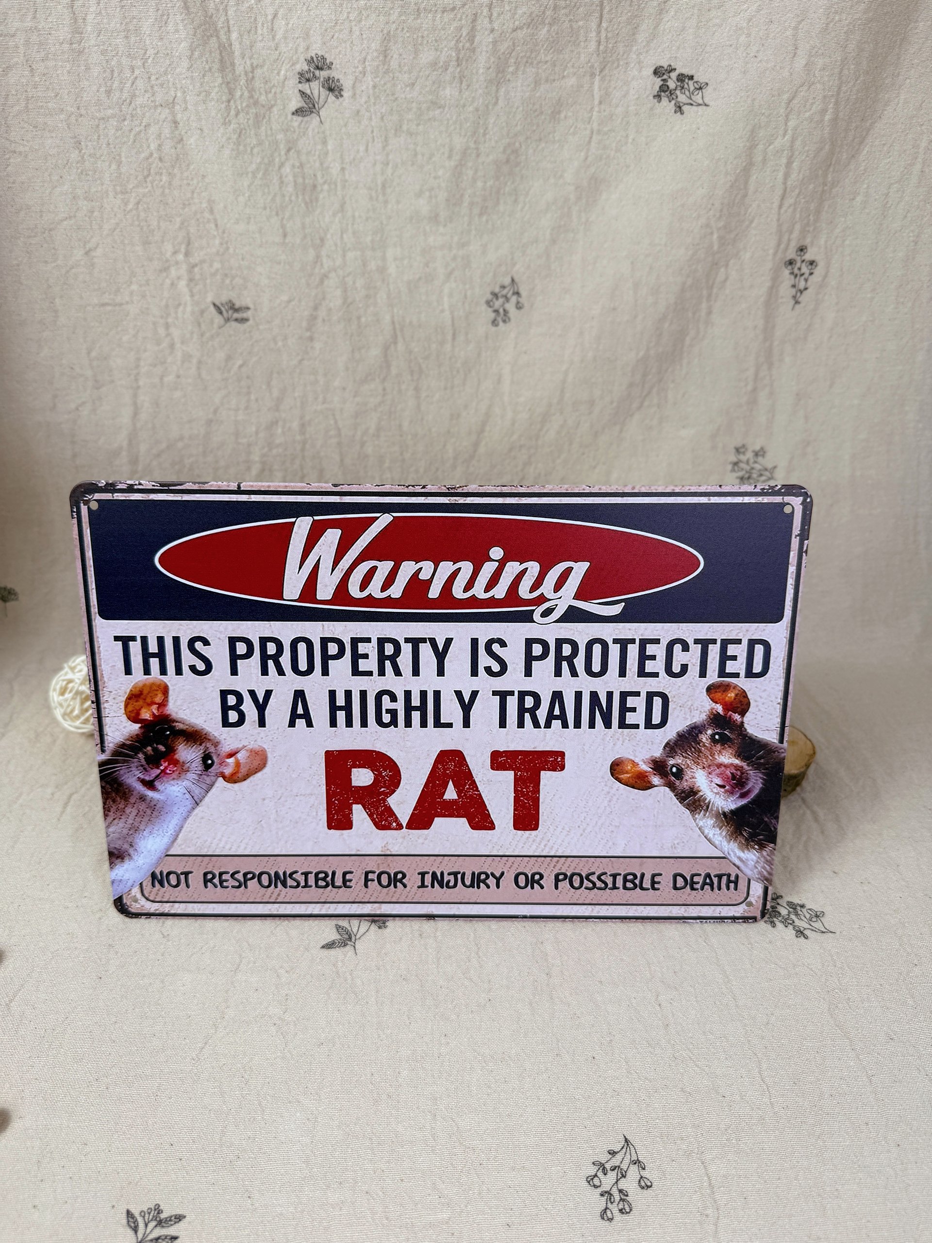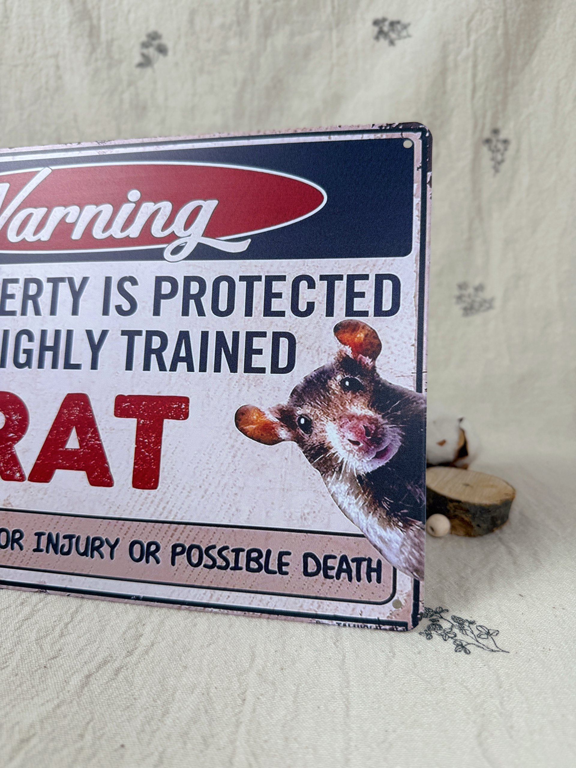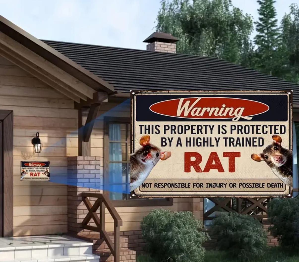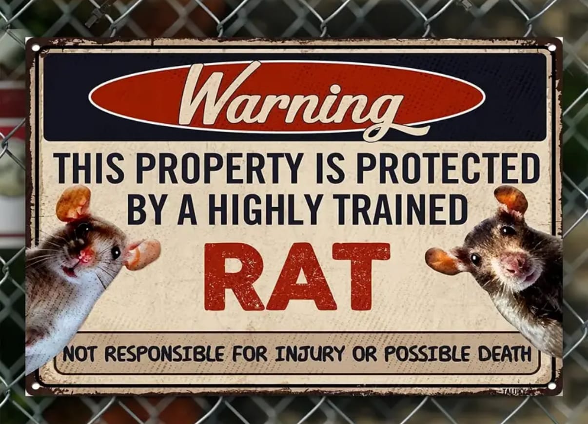 На табличці розміщено жартівливе попередження англійською мовою “Увага: цю власність охороняє висококваліфікований пацюк. Ми не несемо відповідальності за травми або можливу смерть” 🐭⚠️