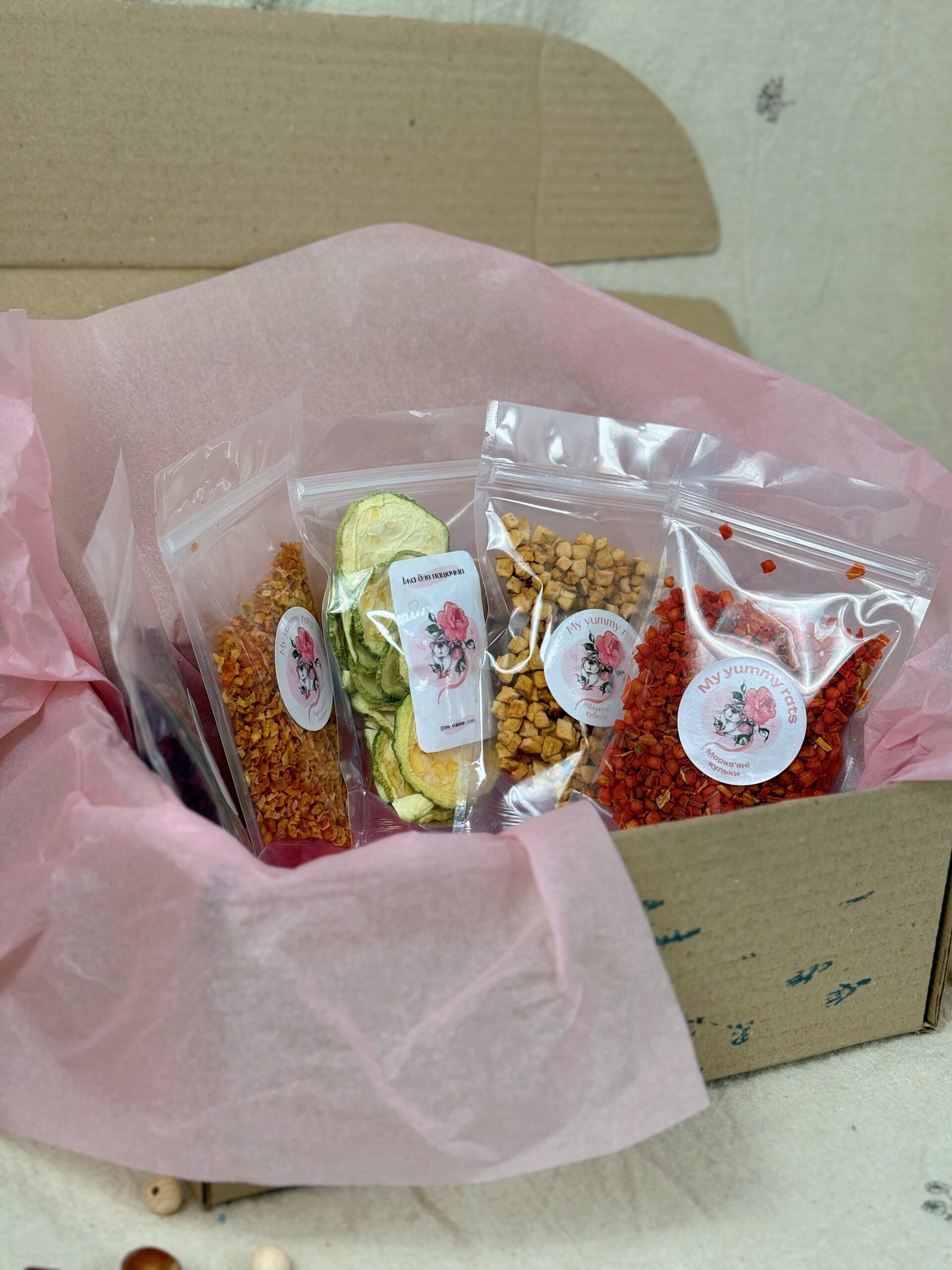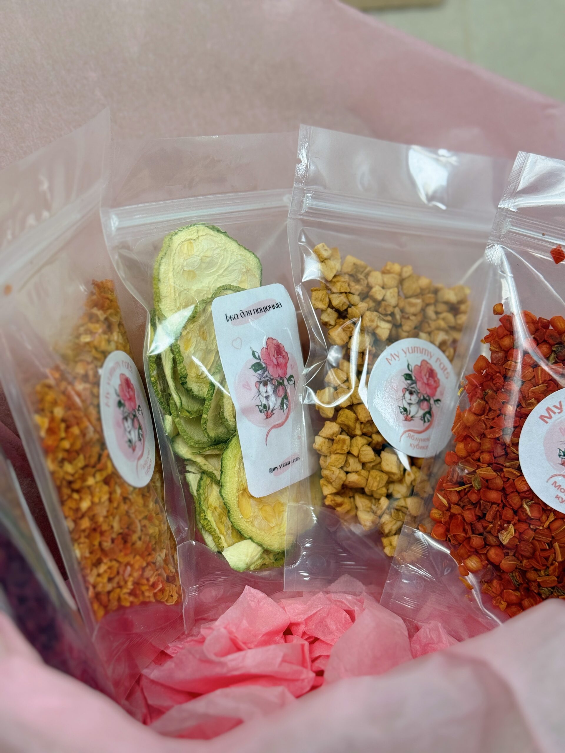 До складу входять чотири види натуральних ласощів: сушений гарбуз, яблуко, морква, кабачок та буряк 🍎🥕