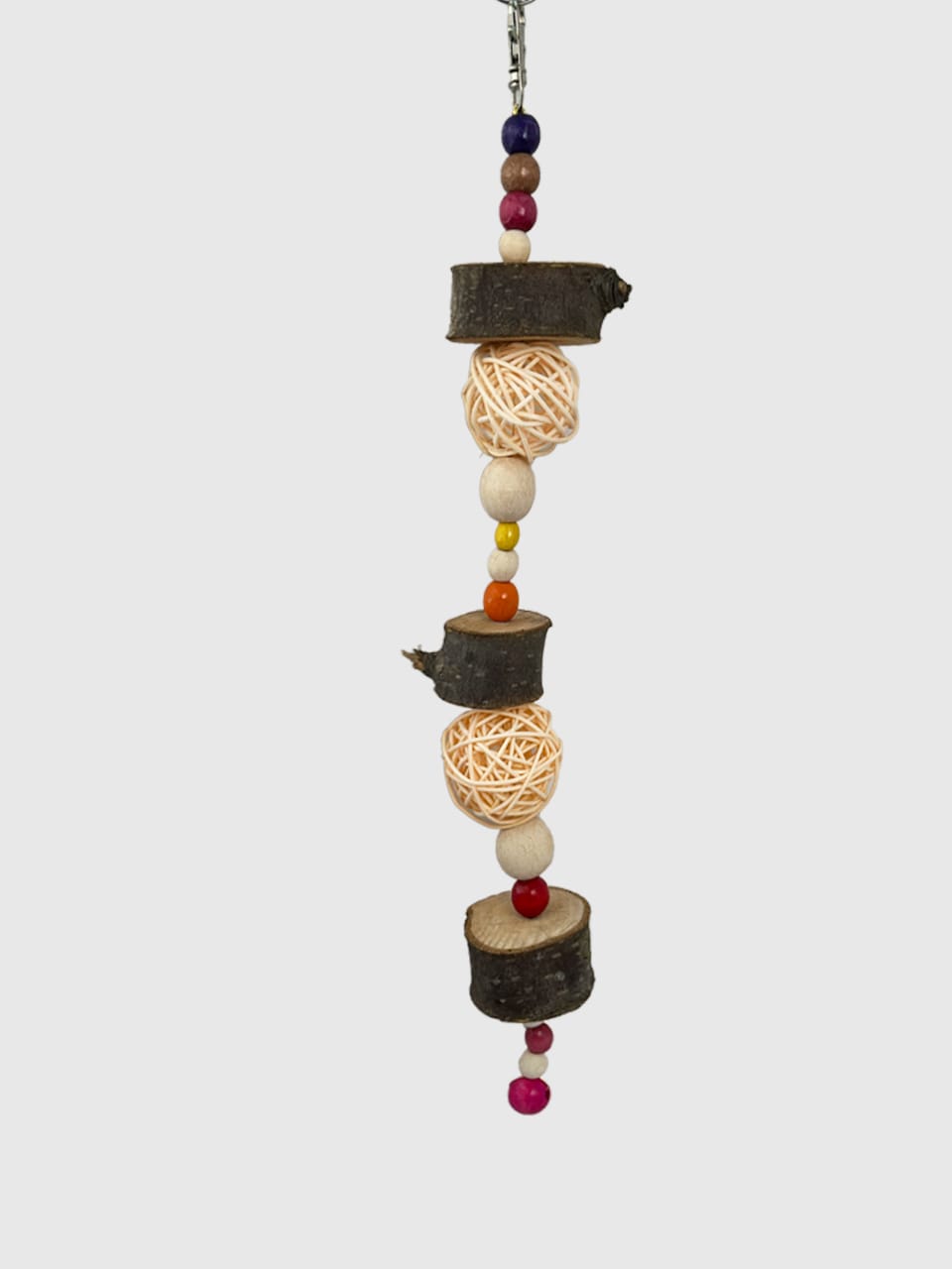 За рахунок натуральних деревʼяних кілець яблуні, деревʼяних бусін та ротангових кульок, іграшка не тільки приваблює гострі зубки гризунів, а й створює атмосферу затишку та краси в клітці ваших малюків ✨